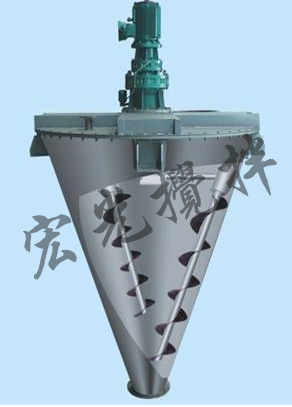 單錐雙螺旋錐形混合機(jī),它由傳動(dòng)部分、筒蓋、螺旋、筒體、出料閥等組成。